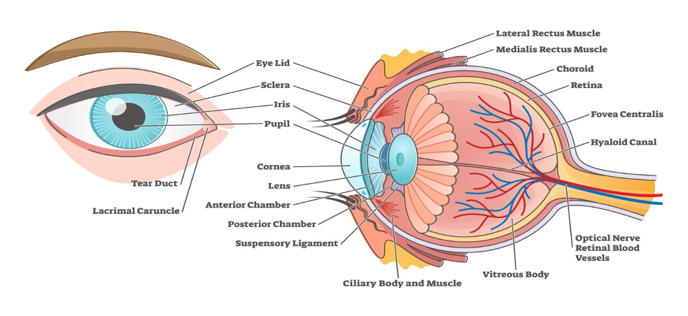 Iris: Muscles that control the pupil— contracting the pupil in bright light and expanding the pupil in low light.