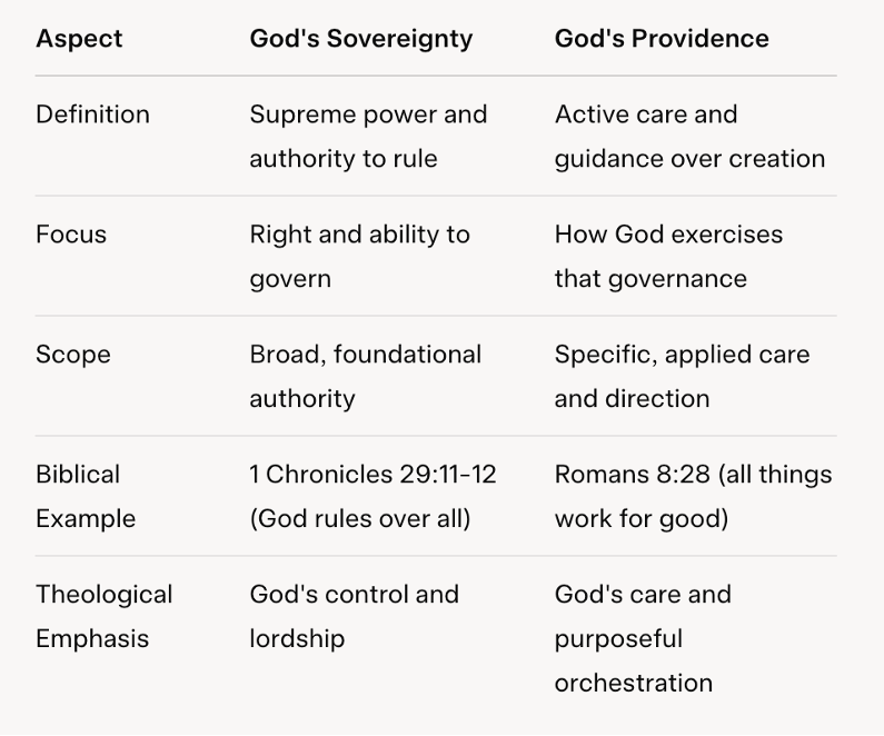 In essence, God’s sovereignty establishes His absolute rule, while His providence applies that authority through intentional, loving direction. Distinct yet inseparable, sovereignty is the foundation, and providence is its expression, ensuring all things align with His eternal plan.
